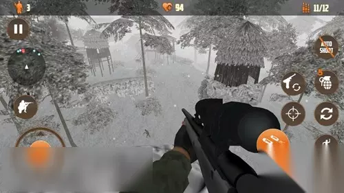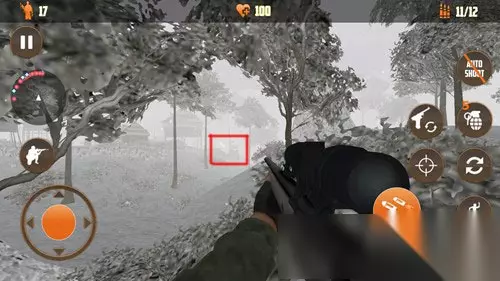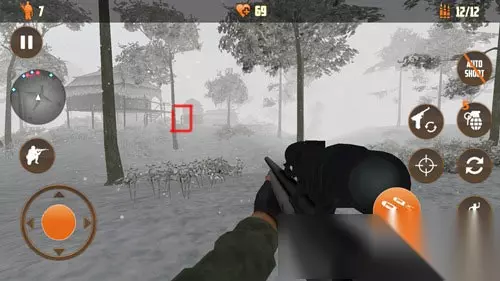 第十关我们进入游戏后也要转身才能看到村庄,转身后向前走一点,在两棵树中间的空隙可以看到前面村庄吊脚楼下面有一个敌人,开镜消灭他。