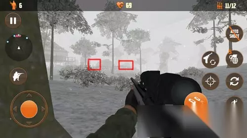 然后我们继续向右移动,在下图地方停下来,前面两个红色区域都会看到有人影,大家可以开镜查看。