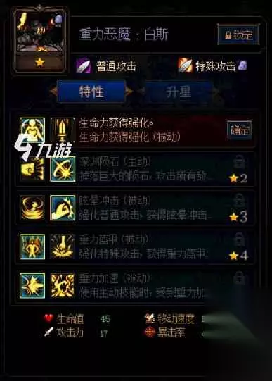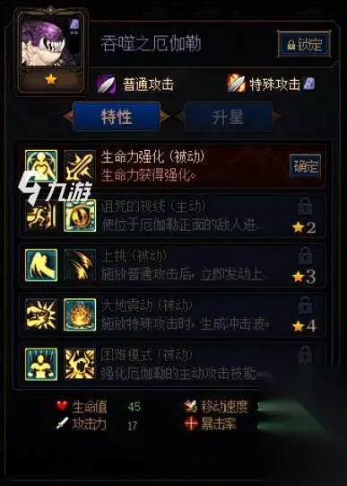 厄伽勒也是前排肉坦,其控制要强于白斯,5星能使主动技能提供3秒控制效果。加点上,建议选择生命力强化、诅咒的视线、上挑、大地震动、困难模式。