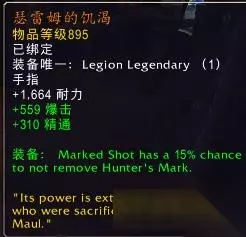 标记射击有15%几率不消耗猎人印记。 这件装备是对死眼debuff覆盖率的一个提升,触发时连续可以视情况连续使用标记射击或者暂时保留猎人印记,总体效果是为我们带来更多的标记射击,对输出同样有一定的提升。