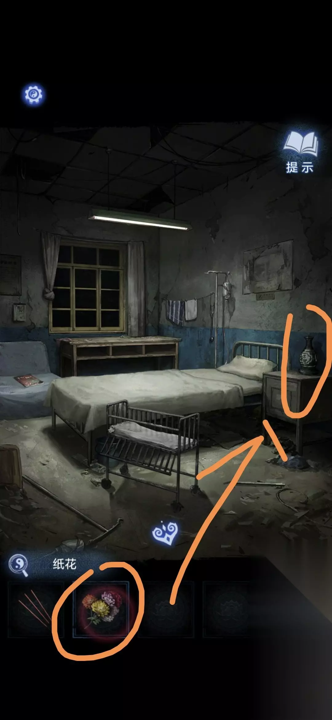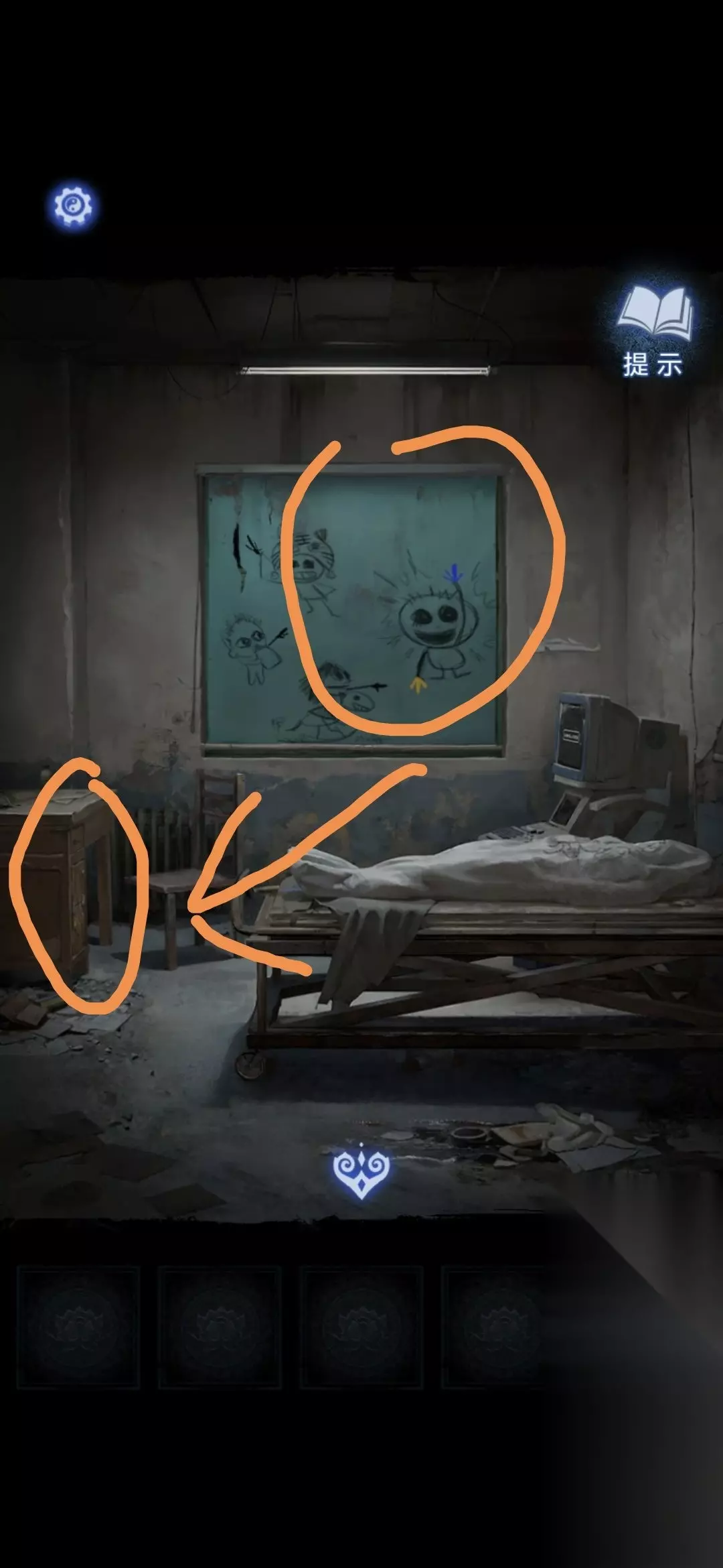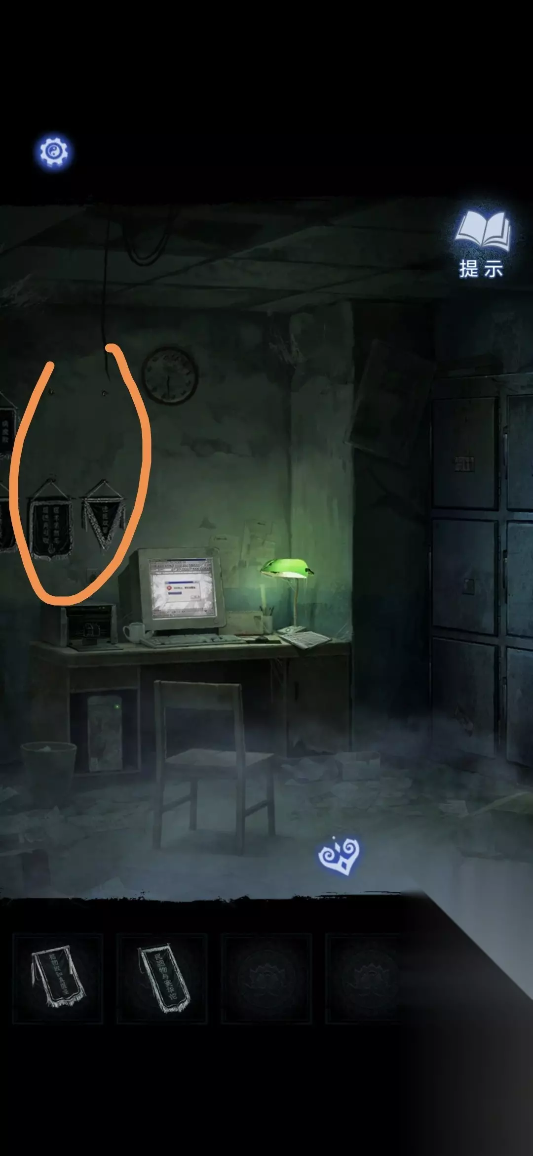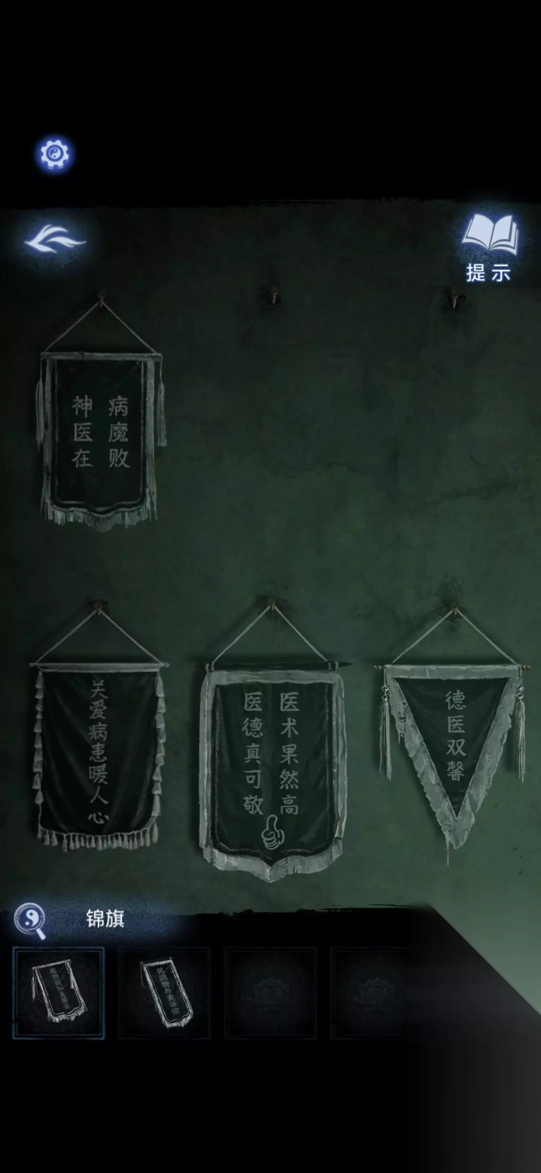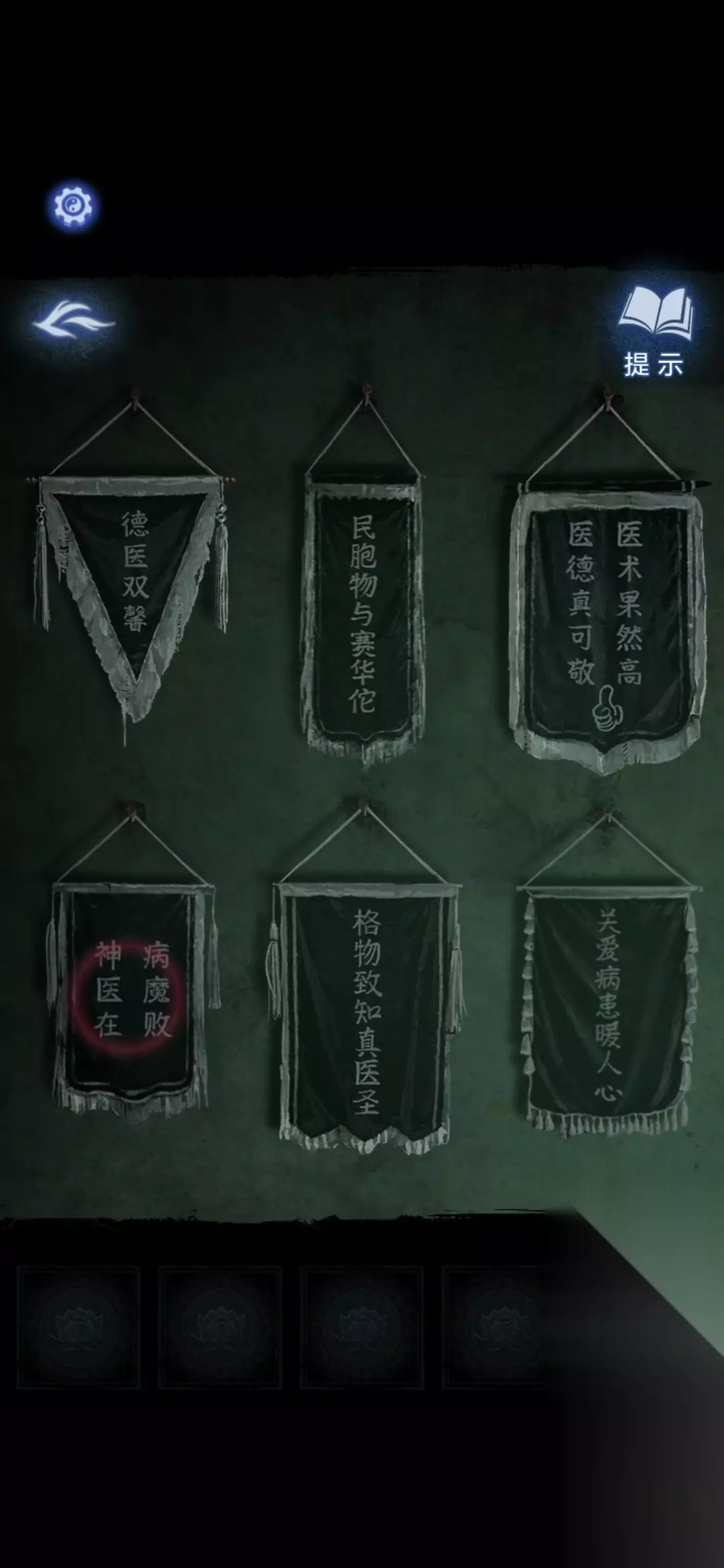 进入办公室,点击墙面,将锦旗挂在墙上,根据台灯下的资料排列锦旗顺序,打开停尸柜,获得香