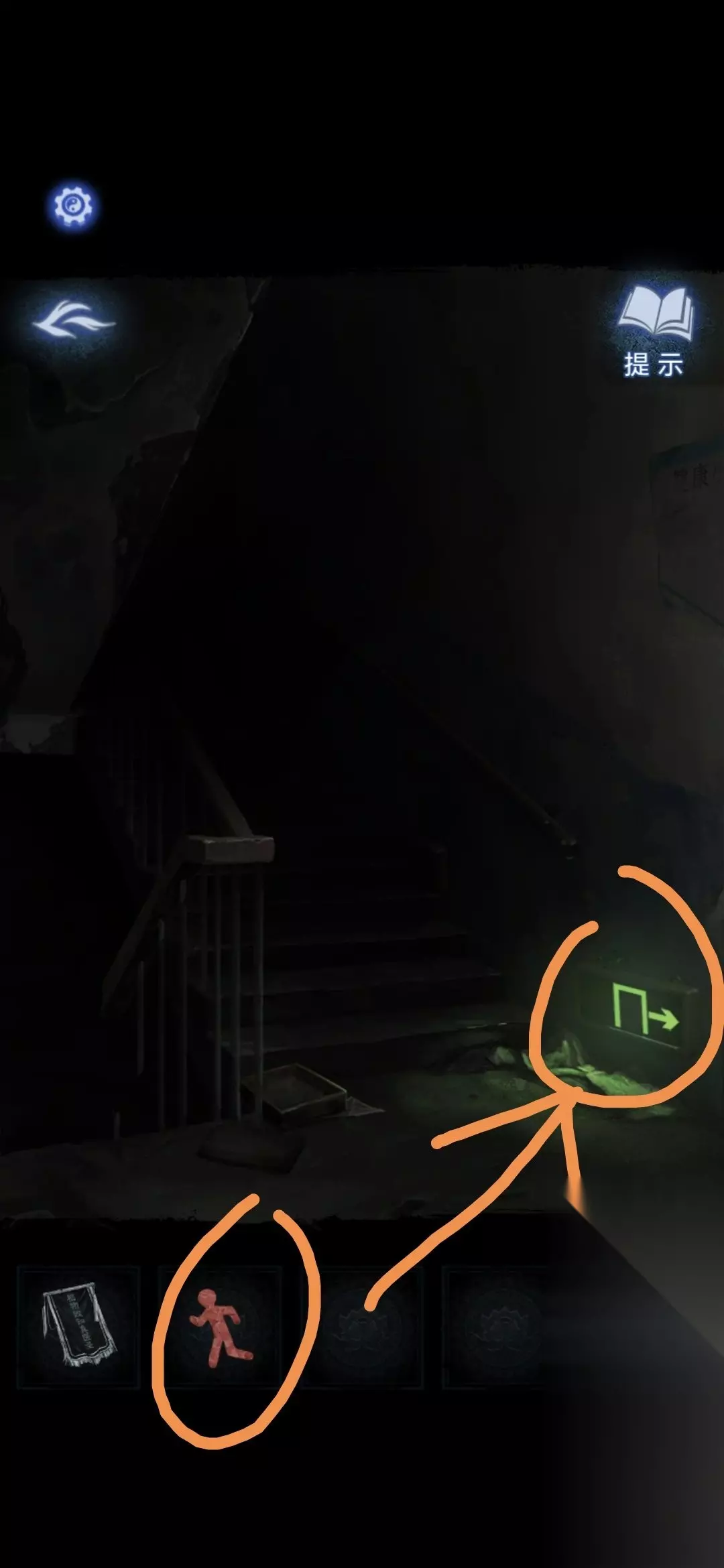 把剪纸小人放在楼梯间的安全通道标志上, 楼梯间亮起