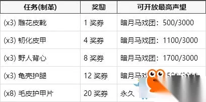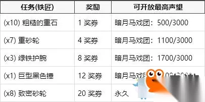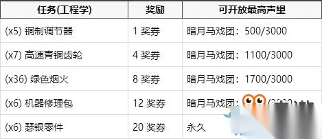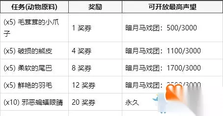 《魔兽世界怀旧服》暗月马戏团奖券有哪些?暗月马戏团即将在魔兽世界怀旧服第三阶段上线,其中有着奖券系统,玩家可以通过奖券来获取相应的奖励,下面小编带来了相关的攻略,一起来看看吧! 暗月马戏团奖券: 通过完成一些帮助暗月马戏团的商贩收集所需物品的任务以及特有的专业技能任务,你可以得到一定的奖励,并在暗月马戏团里兑换到两个稀有项链,以及其他一些小奖励。 目前这里不能取得的专业技能任务有:附魔,炼金术,草药学,裁缝,剥皮和采矿。 如果没有相应的专业技能,你无法取得暗月马戏团里的专业技能任务。 奖券是 灵魂绑定 的,所以你无法交易它们。 所有人均可以做收集物品的任务。你可以积攒着赢得的奖券,每一组奖券可堆垒到200张。 完成每项任务都将得到 100点暗月马戏团声望 。随着你的阵营声望渐涨,低于你声望等级的任务也将不再出现了。 等级1任务 - 当暗月马戏团声望达到 500/3000 后不再出现。(完成5个任务) 等级2任务 - 当暗月马戏团声望达到 1100/3000 后不再出现。(完成11个任务) 等级3任务 - 当暗月马戏团声望达到 1700/3000 后不再出现。(完成17个任务) 等级4任务 - 当暗月马戏团声望达到 2500/3000 后不再出现。(完成26个任务,人类只须完成23个) 等级5任务 - 永久开放。
