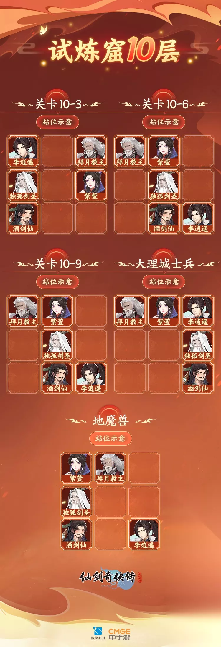 本攻略由明星攻略官:jm创作 *不代表官方观点 今天,我们将继续为大家带来试炼窟9层至10层的攻略,帮助大家完整通关试炼窟。攻略将围绕jm大神的通关阵容和站位安排展开,同时也会深入解析一些难以攻克的敌人特点。攻略马上开始! 试炼窟九层 试炼窟第9层目前怪物数量最多的,其中有点难度的是9-15和9-30这二组头目怪,分别有3只草精,只要快速打败1只草精就可以稳定过关了。 伙伴配置 1、独孤剑圣(112级):白3圆满(上阵天地灵脉),五气朝元(肾6)。天赋14,修炼13(并升满)。 装备:橙7星套(罗睺),装备强化连锁140。 镶嵌:真•石头一套(梦貘10、赤炎10、九尾8、人蛇7、蝎魃6、鳐仙4)。 神兵:3星一去不返。 灵蛊:2星飞鱼、3星水神、2星天命、2星冰蚕、2星幽灵、1星火神(最强的我都给独孤剑圣了)。 御魂:战意勃发(神铸套)。 2、拜月教主(112级):白3圆满(上阵天地灵脉),五气朝元(脾10)。天赋11,修炼10(并升满)。 装备:橙6星套(太阳),装备强化连锁40。 镶嵌:真•石头差1个九尾(人蛇8、蝎魃7级、赤炎4、鳐仙4、梦貘4、)。 神兵:2星离魂。 灵蛊:1星傀儡、1星金蚕,3紫(飞蝇、希望、相思)。 御魂:同仇敌忾套(18级,神铸2号、4号)。 3、酒剑仙(112级):白2星。天赋10,修炼8。 装备:橙6星套(太阳),装备强化连锁40。 镶嵌:2真3橙1紫(赤炎4、蝎魃4)。 神兵:3星墨梅。 灵蛊:1星水神、3紫3蓝(毒蛛、暴烈、相思、神游、毒蜂),御魂:战意勃发套(18级,神铸1号)。 4、紫萱(112级):白3圆满(上阵天地灵脉),五气朝元(肝1)。天赋11,修炼10(并升满)。 装备:橙6星套(太阳),装备强化连:60。 镶嵌:3真3橙(赤炎7、人蛇4、蝎魃4)。 神兵:2星洛神。 灵蛊:4紫1蓝(毒蛛、飞蝇、希望、水灵、贪吃、瞪孕)。 御魂:战意勃发套(18级)。 5、李逍遥(112级):9星。天赋8,修炼6(未升)。 装备:橙5星套(太阴),装备强化30。 镶嵌:3橙3紫。 灵蛊:4紫2蓝(火灵、贪吃、水灵、暴烈、毒蜂、瞪孕)。 御魂:同仇敌忾套(18级)。 伙伴站位