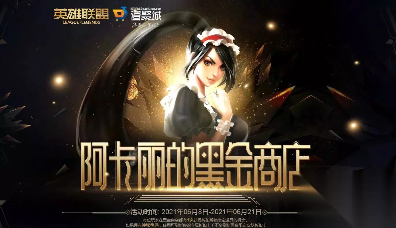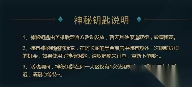 神秘钥匙的作用是拥有神秘钥匙的玩家,在阿卡丽的黑金商店中拥有额外一次刷新折扣的机会,如果使用了神秘钥匙,请玩家取消原来订单,重新下单。 活动期间,神秘钥匙在同一大区仅有1次使用机会,钥匙使用存在延迟。 2021年6月8日-6月21日 点击进入