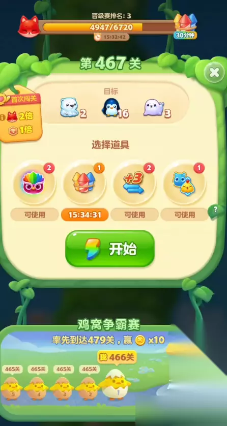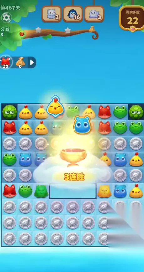 游戏一开始只有短短3步的操作时间,这3步可得抓紧了!咱们的重点就是集中火力,尽快消除掉右边最底下那层雪块。3步一过,那个大石门就会哗啦一下翻转过来。要是咱们没能在翻转前把底下的雪块清掉,小动物们可就掉不到右边需要它们的位置了,那后面可就麻烦啦。所以开局别犹豫,盯着底部雪块附近能形成的消除赶紧做,为动物下落铺好路。