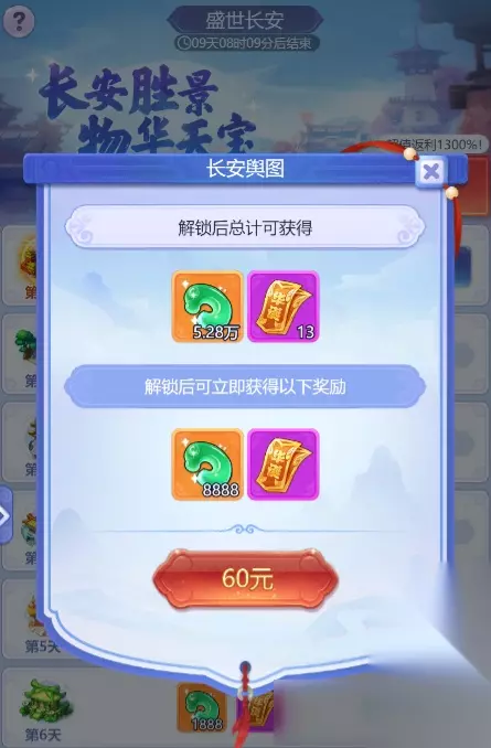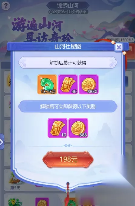 ※这个抽奖,主要靠后面的礼包和签到获得就可以了,不推荐用玉哦! 5.锦绣山河 →一共两个礼包,锦绣山河和盛世长安,不解释,盘他,性价比超值!经济允许的伙伴们,买他!提醒一下,未成年不要充值!
