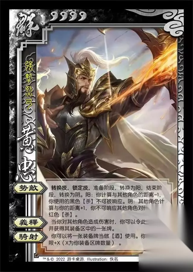 【《三国杀》攻略教程】 《三国杀》谋黄忠技能介绍 谋黄忠为一位群势力男性武将,拥有4体力和势敌、义释、骑射三个技能。 势敌:转换技,锁定技,准备阶段,转换为阳,结束阶段,转换为阴。 阳:你计算与其他角色的距离-1,你使用的黑色【杀】不可被响应。 阴:其他角色计算与你的距离+1,你不可响应其他角色对你使用的红色【杀】。 义释:当你对其他角色造成伤害时,你可以令此伤害-1,并获得其装备区中的一张牌。 骑射:你可以将一张装备牌当做【酒】使用。你的手牌上限+X(X为你装备区牌数量) 武将评价:义释可以用于偷装备给骑射使用,可以增加额外手牌和累积爆发。势敌为削弱版本的烈弓,只有+1距离保护却被红杀强制命中,效果较差,全靠阳状态的黑杀带酒强制命中。
