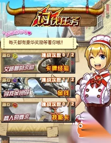 “《怪物猎人大狩猎》手游日常任务之道具系统详细介绍”是小编为大家推荐的文章。讨伐任务是获得大量金币、素材以及艾路猫卡等资源的最直接来源。 任务入口: 主界面->任务大厅->讨伐任务 每天的讨伐任务都会有所改变,具体开启时间如下: 讨伐任务名称 任务奖励 开启时间 消灭怪鸟 炼金虫 周一/三/五 寻找金银岛 金币 周二/四/六/日 商人的要求 奇面族卡
