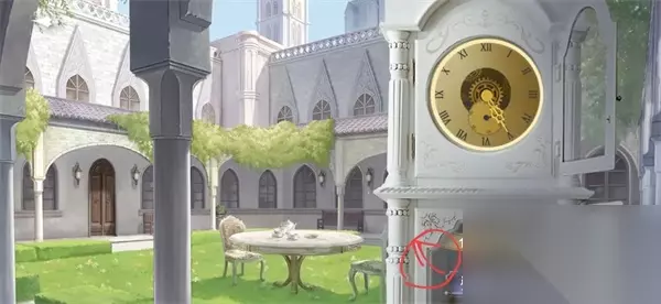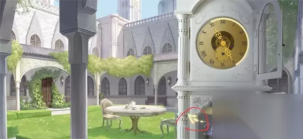 2、进入房间二。在木门位置【观察】并【触摸】。在圆桌处【查看】茶杯。 在挂钟处【查看】并【拨动指针】,一次进入12小时前、6小时前和12小时后。 再将指针拨回12小时前,前往木门【转动把手】,离开花园。