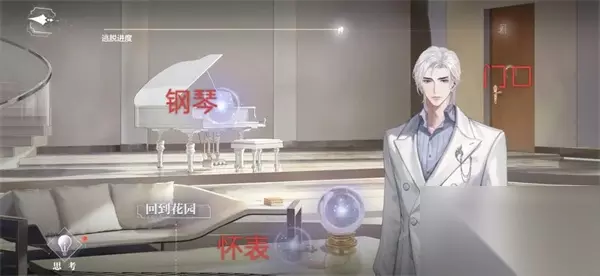 3、前往房间三。在门口【观察】钢琴后,弹奏钢琴,顺序和结局一一致。(过程中不要点击思考)再去门口离开即可达成通关结局。