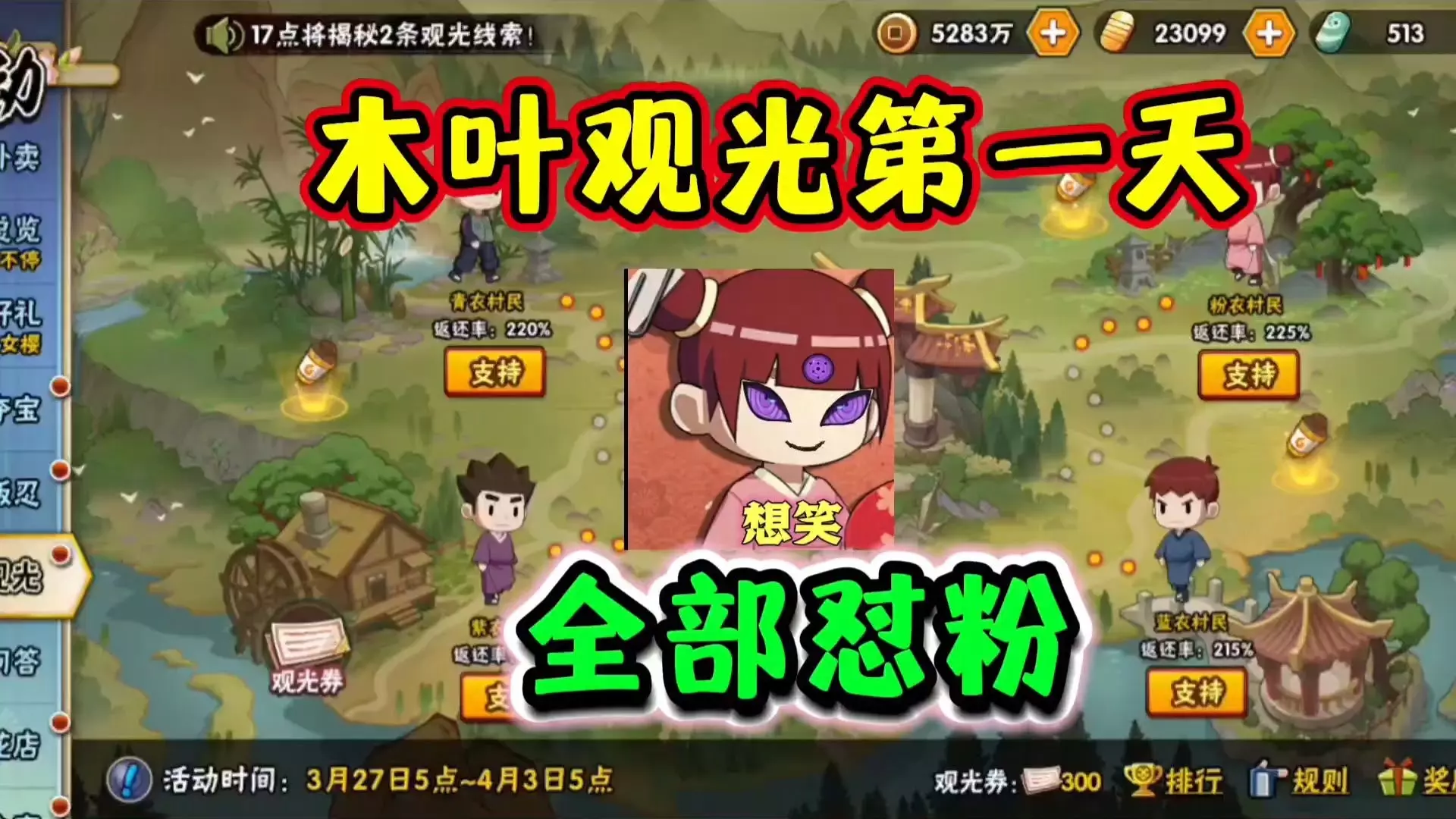 这是火影手游木叶观光活动首日的情报分享,作者选择梭哈小粉,还分析了青衣村民、蓝衣村民的观光宣言与事件,推测前者后续大概率减分,后者可能还会加分,玩家可领取观光券支持选手。