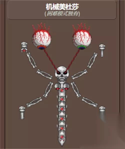 机械美杜莎是泰拉瑞亚这款游戏中的boss之一,机械美杜莎boss是游戏中比较特殊的boss,那么大家知道,在游戏中怎么召唤机械美杜莎boss吗?小编今天就告诉大家答案。 泰拉瑞亚机械美杜莎怎么触发 召唤方法: 1、使用【奥库瑞姆剃刀】手动召唤 2、大家在摧毁【恶魔祭坛】或【猩红祭坛】后,且大家在只要当前世界没有击败过机械美杜莎的前提下,那么机械美杜莎boss,就在黄昏(7:30 下午)时,有5%几率自然生成。