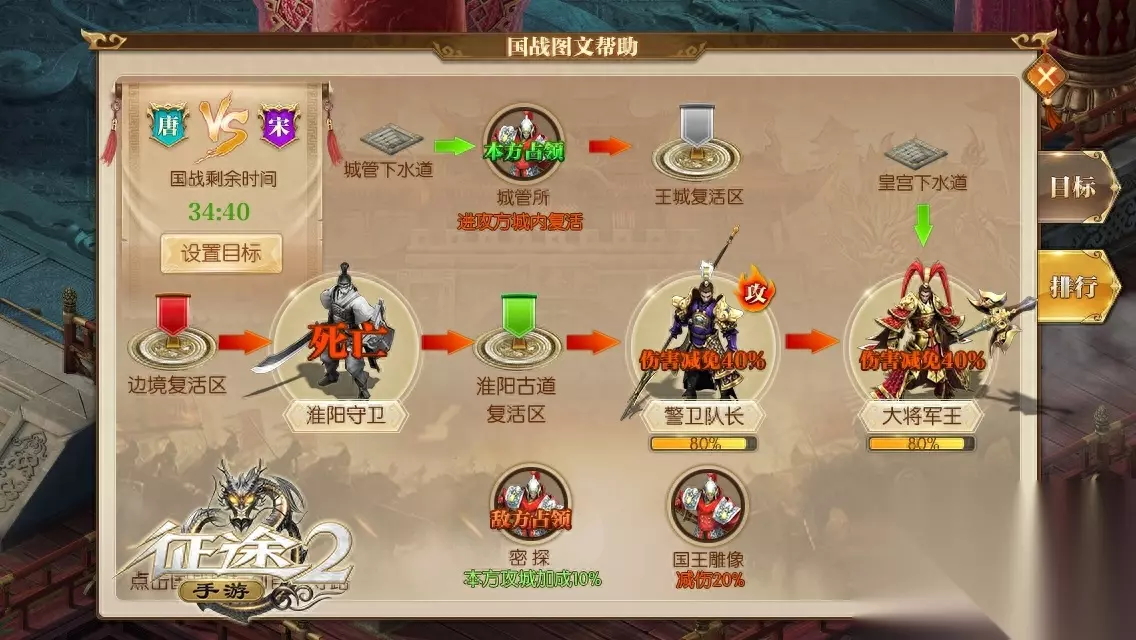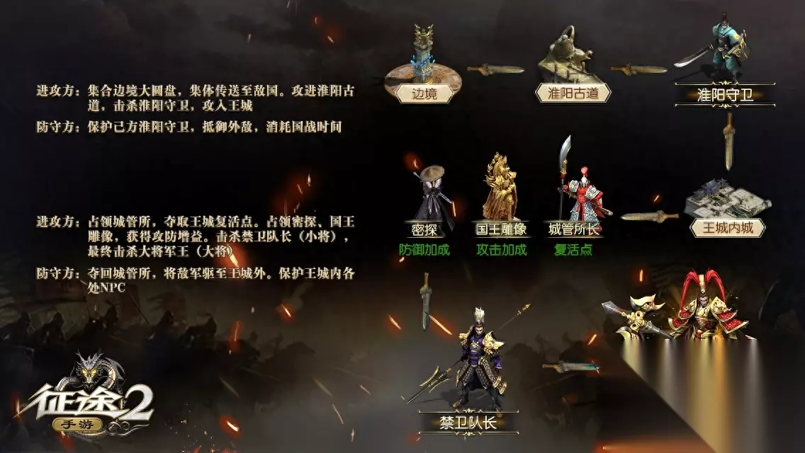 对人海战术说no 这里策略说了算 言归正传,下面让我们一览国战玩法吧!对于进攻国家来说,首先要在淮阳古道击杀NPC淮阳守卫后方可攻入王城,进入敌国王城后,最终击杀大将军王(常用黑话:大将),便就能取得国战胜利。
