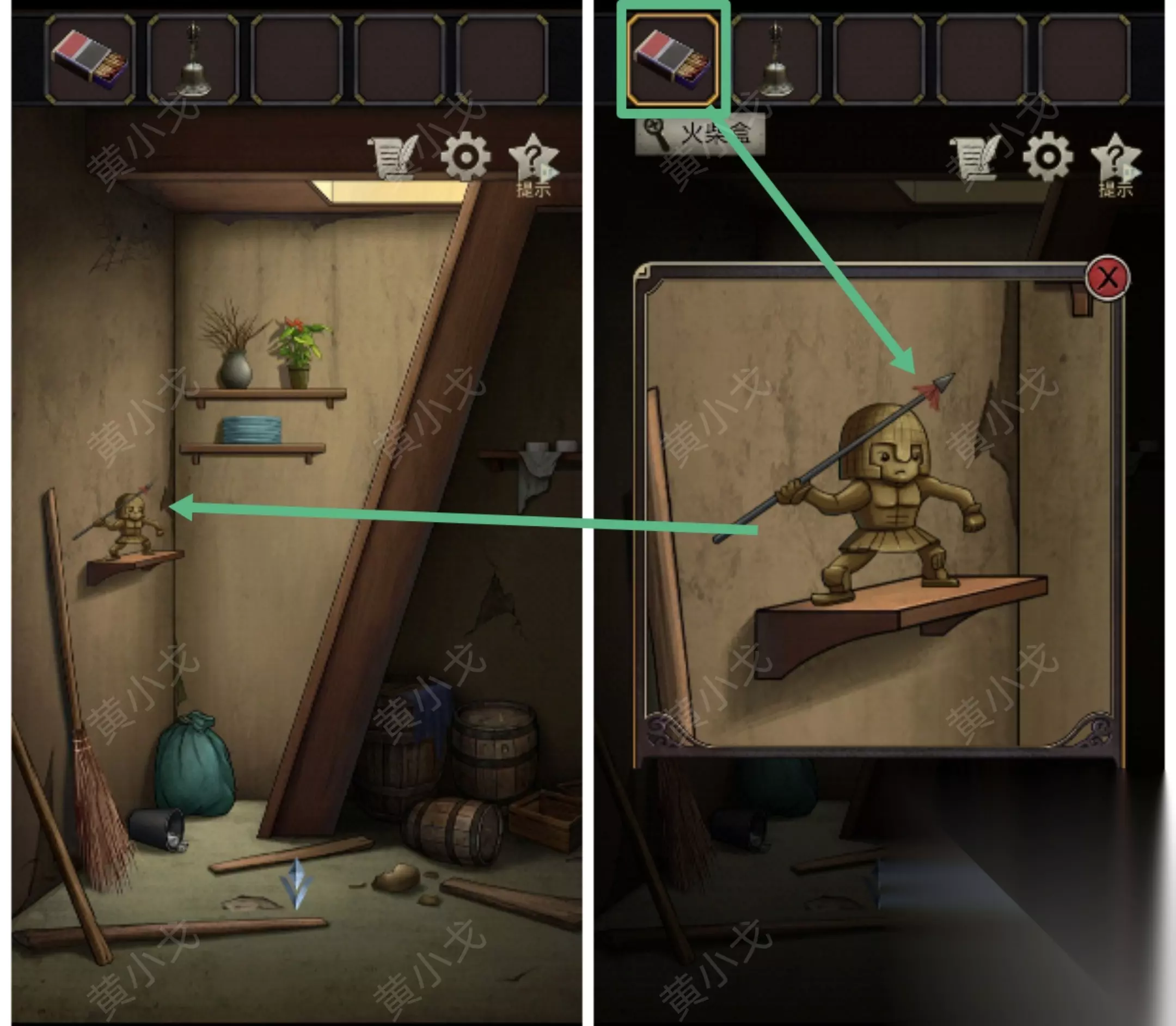 24.点击架子上的雕像,用【火柴盒】点燃长矛,长矛掷出,点燃煤油灯