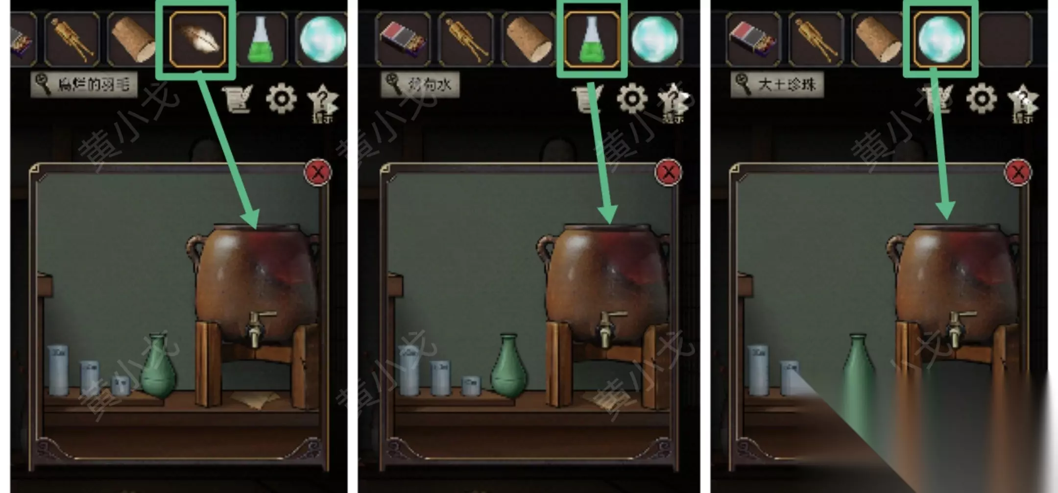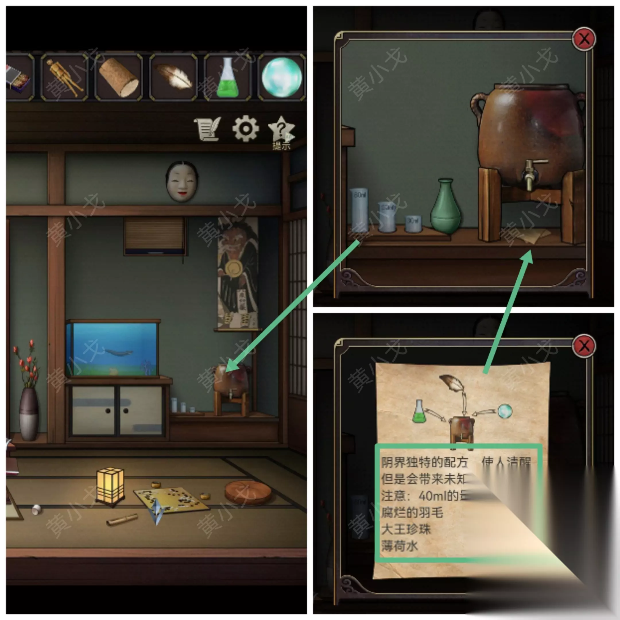 13.把【腐烂的羽毛】、【大王珍珠】和【薄荷水】放入药炉中;完成小游戏( 13-1.玩法:倾倒瓶中液体,制成指定剂量的药剂 13-2.步骤:接50ml的量杯,倒入30ml的量杯,剩20ml,倒入80ml的量杯 13-3.把30ml量杯倒入50ml量杯,接50ml的量杯,倒入30ml的量杯,剩20ml,倒入80ml的量杯,就得40ml的药剂)