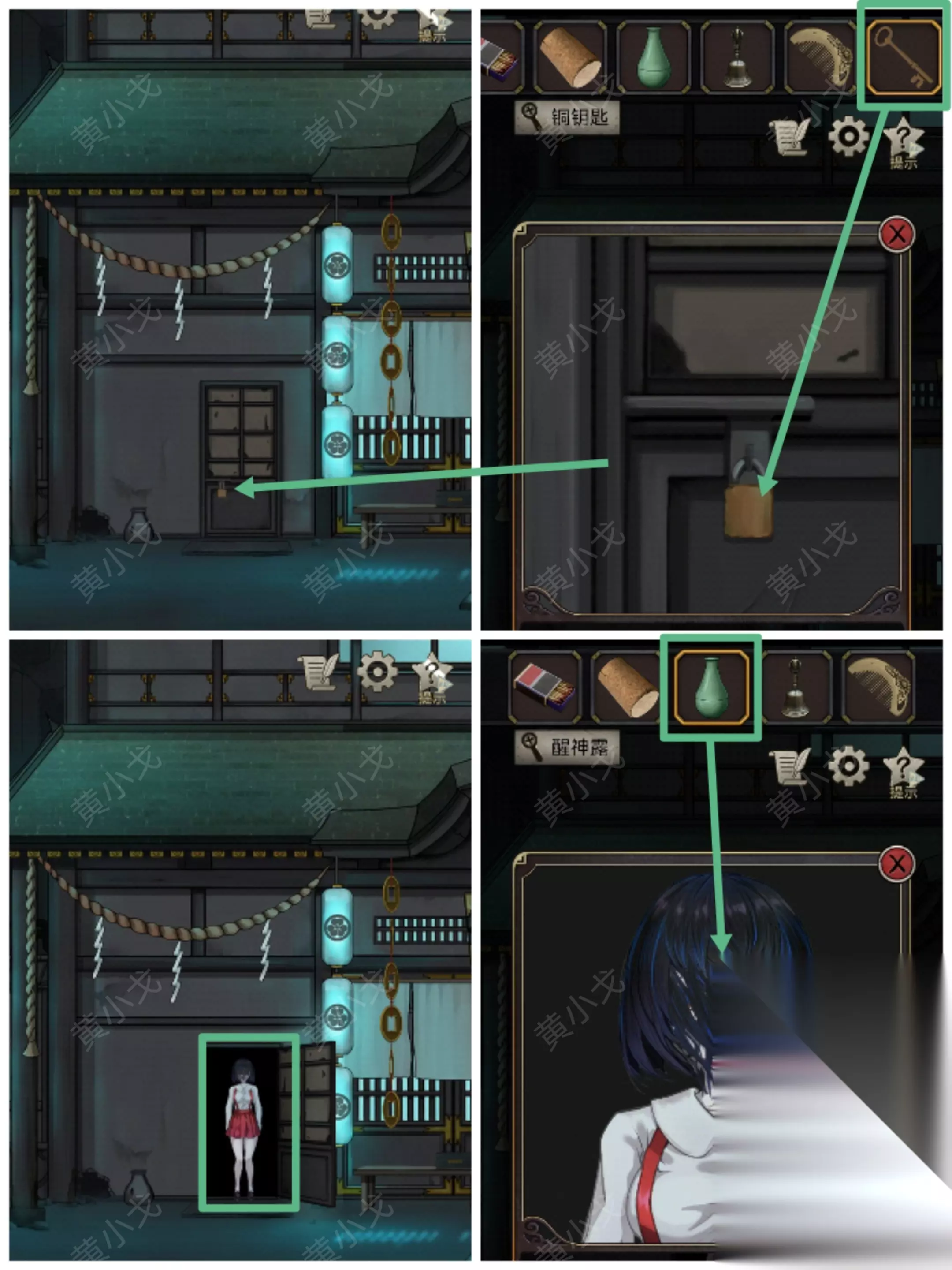 20.点击木棚上的锁,用【铜钥匙】打开;点击花子,用【醒神露】唤醒她