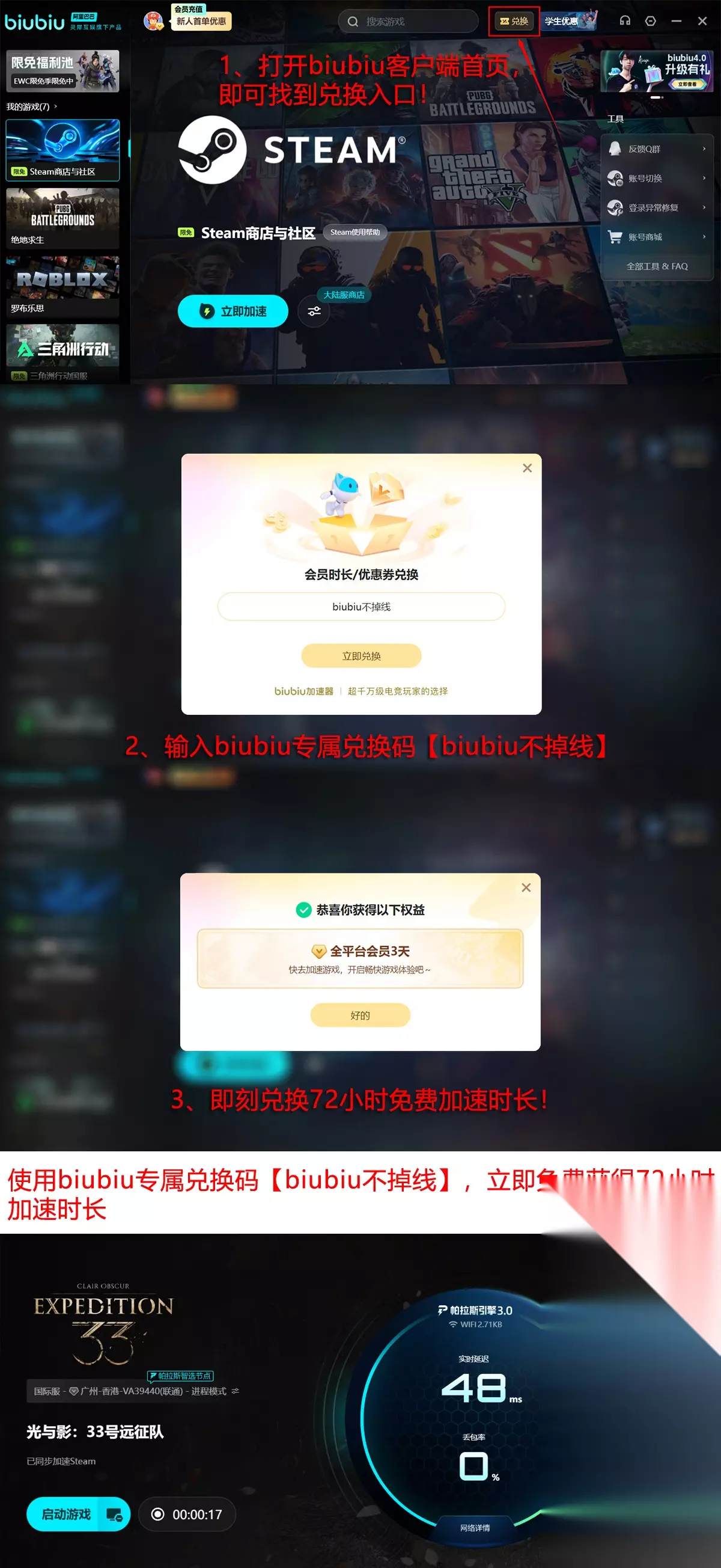 特别提示:即日起至2025年12月25日,biubiu加速器开放《光与影:33号远征队》专属限免加速服务;新用户注册即可获得24小时基础加速时长;参与兑换活动并使用口令【biubiu不掉线】,还可额外获取72小时服务,累计享有96小时加速权益。