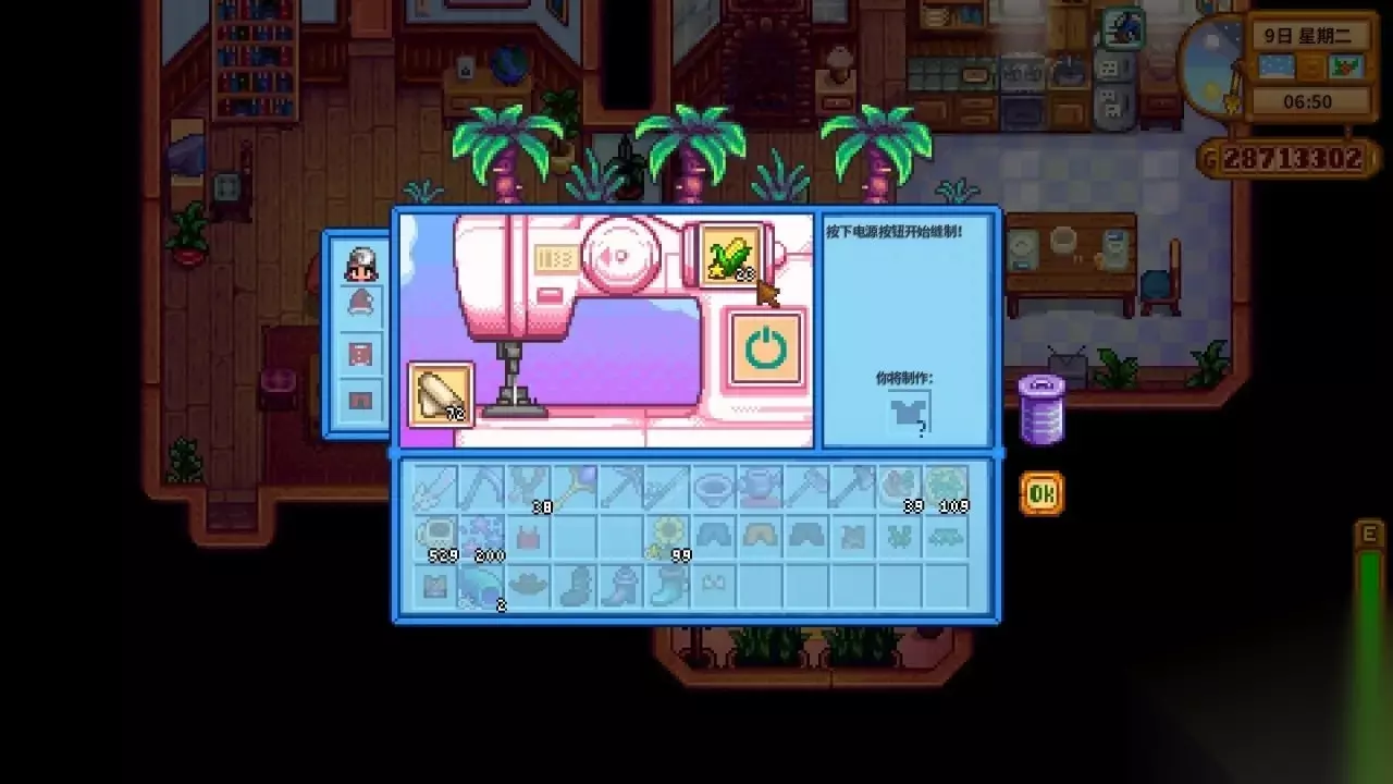《星露谷物语》男女角色穿搭搭配一览 1.缝纫机的介绍 在星露谷物语中,如果我们想要制作好看的衣物,就需要用到缝纫机,当我们获得布料后,就会触发艾米丽剧情,随后就可以前往她的家中使用她的缝纫机了,或者完成艾米丽的宝石任务,也会获得一台小缝纫机,缝纫机会有送料口和线轴两个地方,送料口就是放布料,衣物的,线轴就是放一些物品的 布料与物品结合就会产生新的未知衣物