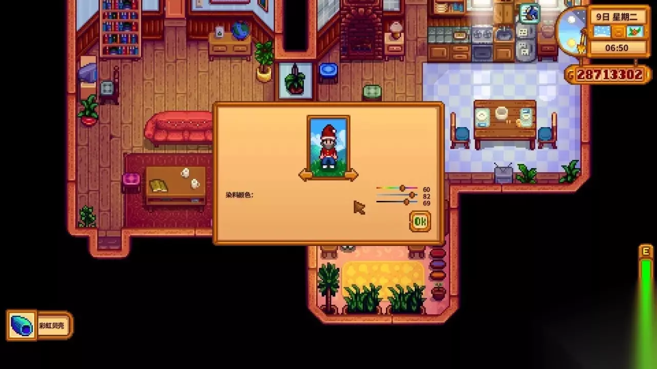 衣物与物品结合就会被染色,如果用五彩碎片或彩虹贝壳来结合,就可以自行调节衣物颜色,接下来的内容我都是会用这种操作来进行染色!