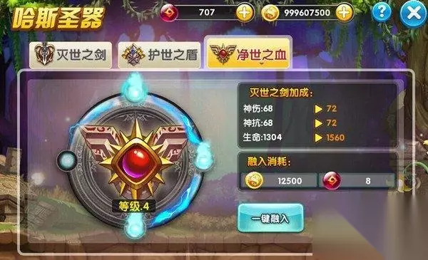 哈斯圣器在玩家达到52级时开启,其分为灭世之剑、护世之盾、净世之血三大部分,对应属性分别为神功、神抗、生命,通过哈斯古境获得的“神圣精华”融入至哈斯圣器内,可大幅提高人物神属性。