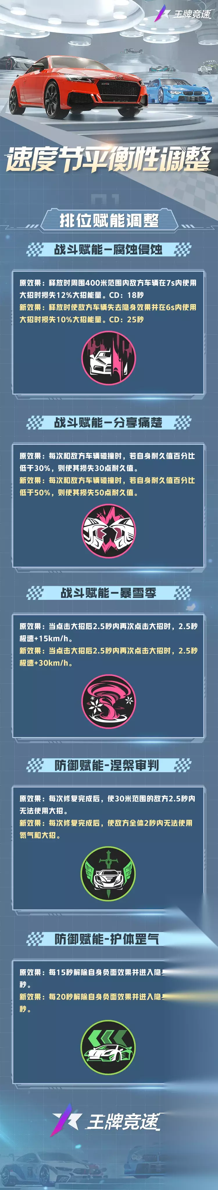 功能优化 1、排位赛、练习赛的录像回放中新增了战斗记录: 战斗记录是一个新增的文本框,它会在录像回放中显示本局比赛中发生的所有重要事件信息。无论是惊险的超车、关键的技能释放,还是决定性的碰撞,战斗记录都会以文本的形式实时同步在左侧的文本框中,旨在提供更全面、更详细的比赛回放,让您可以更好地分析每一场比赛中的关键事件和细节。 (注意:战斗记录只能通过本地录像进入,如果是云端录像数据则需要第二次进入才能显示哦,建议车手以自己的视角查看战斗记录会更加方便) 2、赛季着装度调整优化,上赛季部分继承,殿堂外观永久继承! 当前赛季的赛季着装度主要由赛季车装和赛季衣装两部分组成,数值为赛季车装和赛季衣装的实际数值加和。赛季着装度会在新赛季开始时根据继承规则进行重置。 赛季着装度:当前赛季的赛季着装度主要由以下三部分加和组成—当前赛季获得的永久外观着装度之和(重复获得永久外观时也会按照一定比例计入其中),上赛季获得的永久外观着装度之和*50%继承系数,拥有的殿堂级外观着装度之和。在赛季着装手册中显示时会向上取整。 在赛季着装手册界面点击当期赛季的赛季着装度,可详细显示当前赛季着装度的各部分情况。 每个赛季将根据玩家的赛季着装度排行进行结算,根据排名限时动态头像和限时专属称号。 3、肖老板第四次借钱后返还的纪念币调整为纪念币+绑定纪念币。 4、乐园创建房间可以更快速的切换地图了。 问题修复 1、修复了赛车双喷效果异常的问题。 2、修复了随机车饰方案可能在比赛开始前失效的问题。 3、修复了加速映射的光墙无法正确结算辅助次数和叠加自适应躯壳的问题。 平衡性调整 为了维护车辆平衡性生态,带来更好的竞速体验,本次更新带来了部分排位赋能的平衡性调整。您可以在游戏内或点击下图查看调整详情。