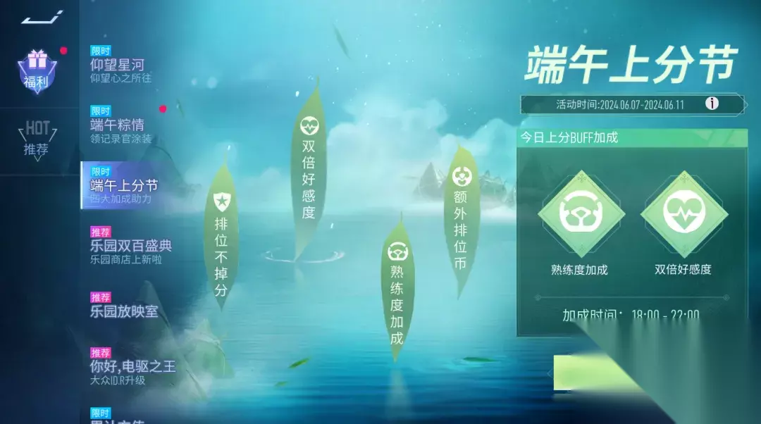 『端午上分节』端午来上分,BUFF来助力!6月7日-6月11日,每晚18:00-22:00登录游戏即可享受排位不掉分、额外排位币、双倍好感度、熟练度加成等不同加成奖励。每日开启的加成效果不同,记得上线查看哦~