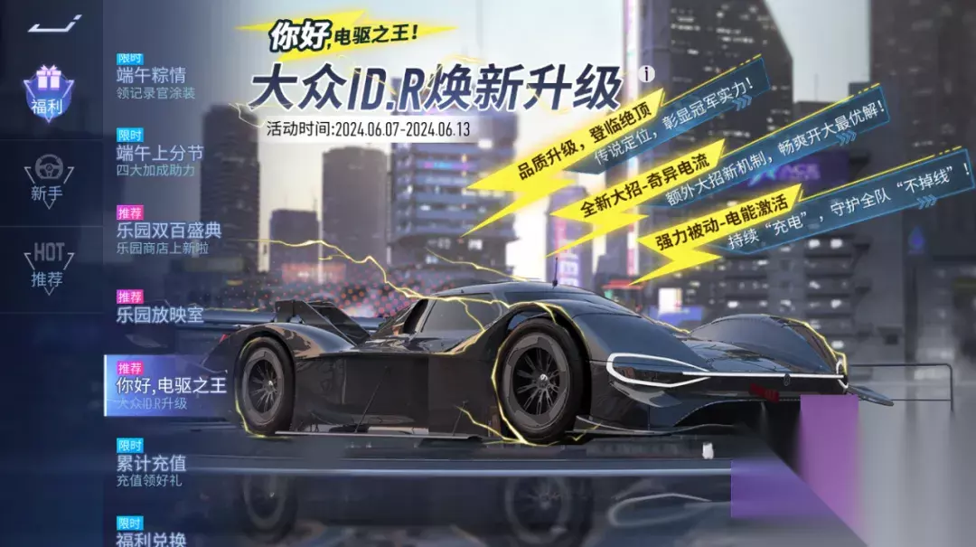 大众 ID.R升级 你好,电驱之王!大众ID.R焕新升级即将上线,快来游戏一探究竟吧!6月7日起,分享还可领取采购补给券*3!