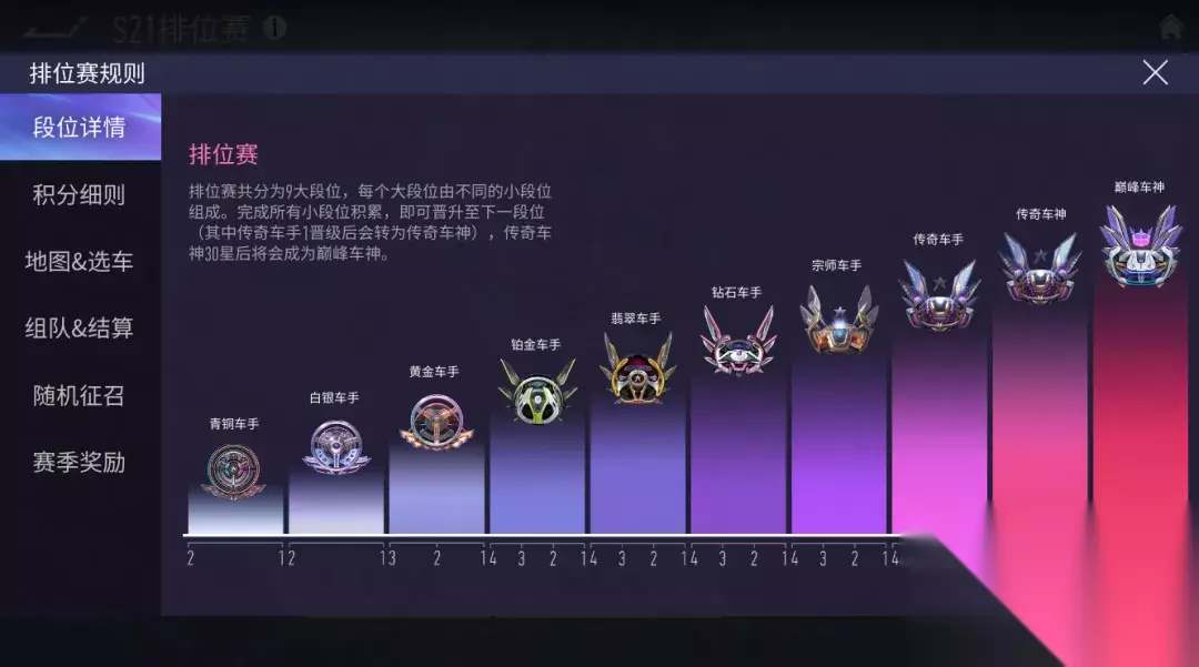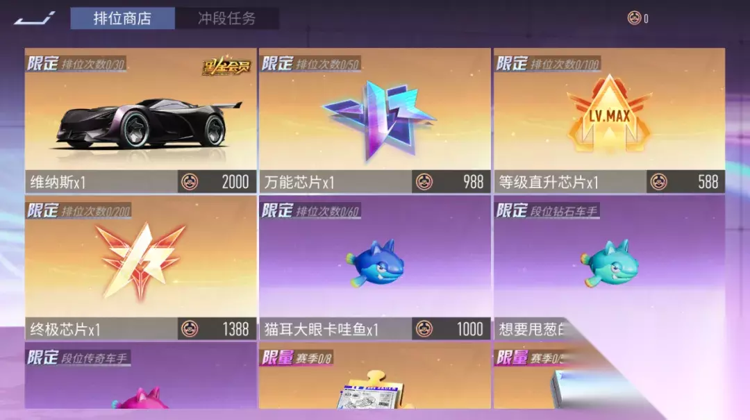 除此之外,我们还对排位赛进行了以下调整: 1、减少了前两个大段位的小段位数量,前期上分体验更顺畅。 2、调整了巅峰车神的结算方式:传奇车神30星将会自动晋级为巅峰车神。 3、新增排位赛全国榜单,现在可以看到所有服务器中的车手排名了。 4、晋级传奇车神后,全国榜单前1000名的车手将会开始计算排名并进行展示。 5、新增了“历史首次到达段位奖励”,从S21开始,当你历史首次到达目标段位后,即可获得额外的奖励,所到达的段位越高,奖励越珍贵。 6、首胜积分翻倍段位调整:新赛季开始后,巅峰车神段位以下的玩家们在每日首场胜利所获得的排位赛加分将会翻倍。 本期排位赛的奖励一如既往的丰厚,除大量的升级材料外,兑换商店还将限时上架车辆:维纳斯和 进阶改装件“猫耳大眼卡哇鱼”(段位提升可以解锁更多进阶改装件)。在原本的基础上,本期排位赛商店还新增了【万能芯片】、【等级直升芯片】、【终极芯片】,帮助车手们更快提升。