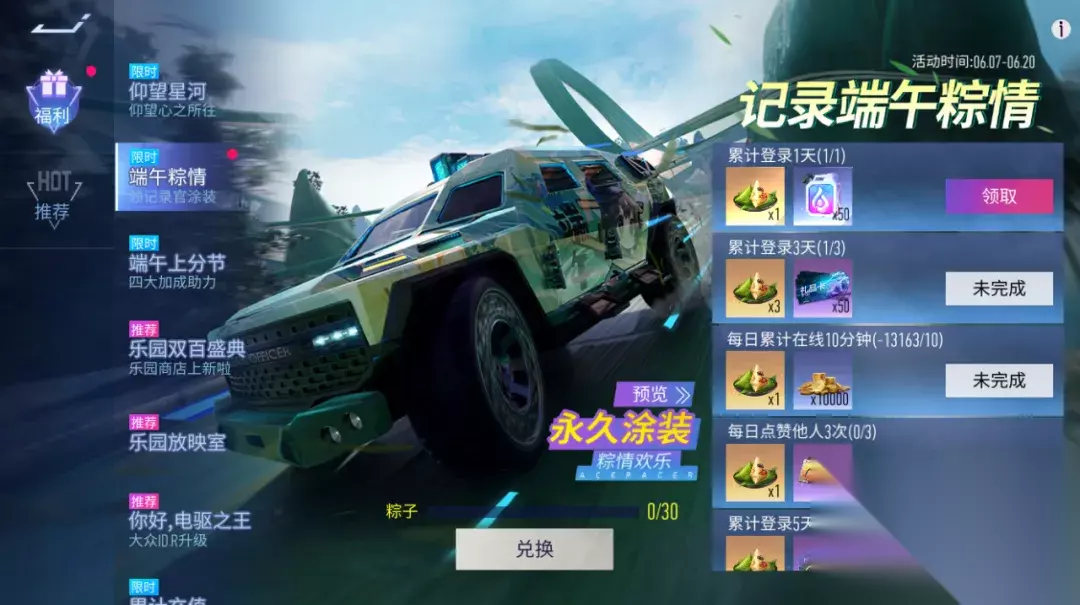 『七日签到』七日签到送青伞手持!6月7日~6月13日,登录即可领取车贴 粽子和手持道具 青伞悠悠! 福利活动 『元气初夏折扣节』元气初夏,活力无限!6月7日~6月20日,元气初夏折扣节惊喜来袭!活动期间,车手们可前往商城抽取自己的专属折扣(专属折扣仅用于纪念币商品,人民币直售商品不享受专属折扣)!全新时装幼稚园、青青子衿,轮毂彩虹糖、泰拉,涂装夏日冲锋、蔚蓝谧夜等超多外观等你来拿,超值折扣不容错过!心动不如行动,快前往商城查看吧!