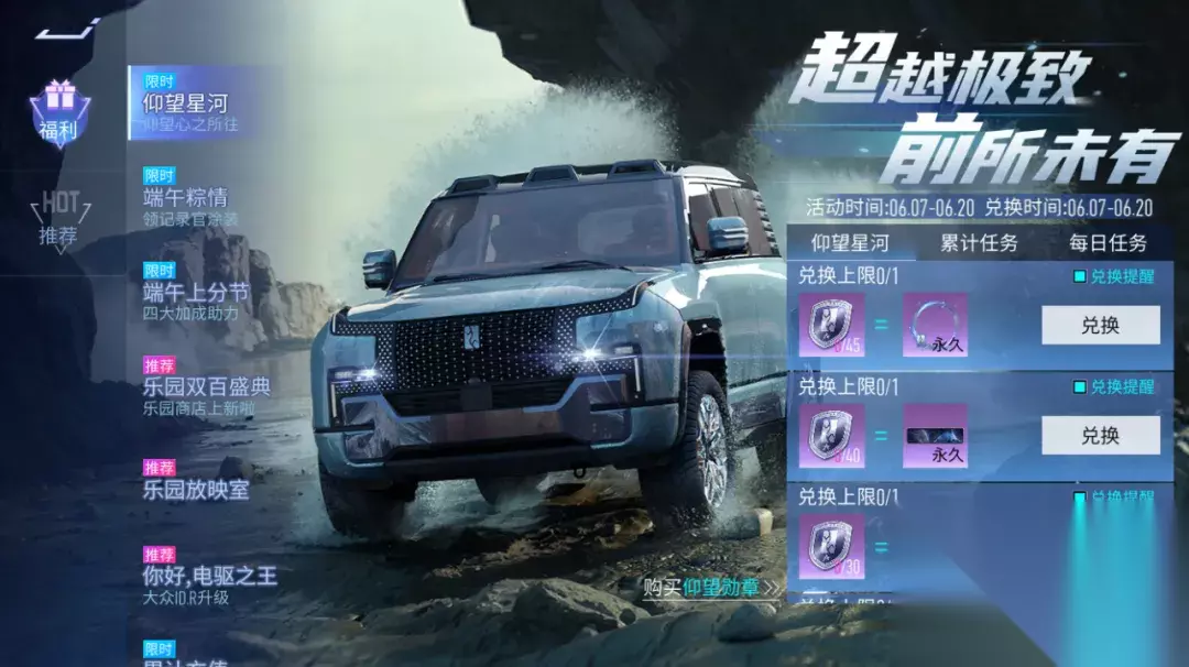 『仰望星河』超越极致,前所未有!6月7日~6月20日活动期间完成任务可获得“仰望勋章”,可在活动期间兑换奖励:仰望头像框、车牌 仰望星河、车贴 仰望、传说蓝图碎片等奖励。