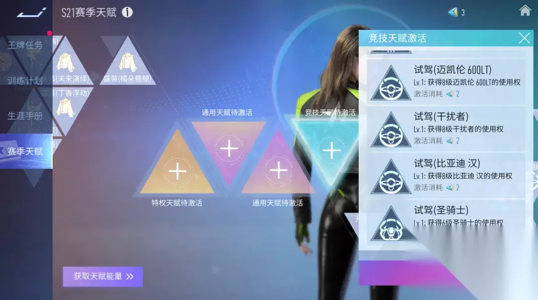 赛季天赋 赛季天赋已更新。助力车手们在新赛季里愈战愈勇。 本期上新的赛季天赋包含:"圣骑士"、"未来演绎"、"橘朵糖糖"、"剧毒曼巴"。 赛季更新后,上一期的天赋能量、天赋特权及任务进度将被清空重置,同时系统将赠送3点天赋能量。