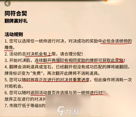 你可以获得在同符合契中出现的任意统帅,每一局翻牌的机会有上限,连续翻开两张一样的可以获取对应奖励,随时放弃翻牌重置进度,随时放弃翻拍英雄选择另一位英雄 二、奖励