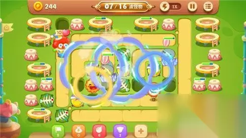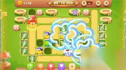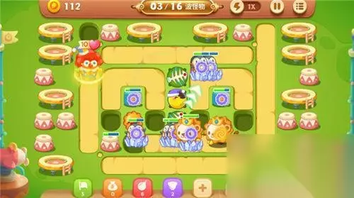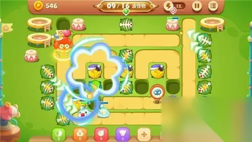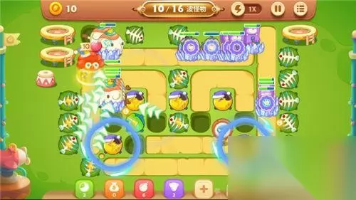 为了能不漏怪,阿波不仅增建了顶级月亮减速炮塔,而且还增建了范围大杀伤强的鱼刺炮塔群,多拐弯的路线能让怪兽们遭受到更高密度的打击哦!阿波在全图建设15-20座鱼刺炮塔、8-10座月亮炮塔、5-7座瓶子炮炮塔,炮塔群在灭怪的间隙还可以缓慢的清理全图剩余的障碍物。第15波的怪兽异常强大,阿波不得不让雪藏的小丑来出战,它的绝技【缤纷彩球】能让全图的所有位置处在波纹状彩球的攻击之中,瞬间就能清场哦!就这样一直坚持到最后吧!