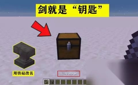 ③如何获取钥匙;当玩家手持名为“我叫Minecraft”的物品打开箱子,这件物品便是对应了上锁箱子的钥匙!要知道铁砧除了修复装备耐久、给装备敲上附魔之外,他还有一个作用:便是给物品进行命名。 ④钥匙可以是任何物品;我们以剑为例,当玩家给在铁砧上把剑重新命名为“我叫Minecraft”时,这个时候这把剑可以用来战斗,也可以作为开箱的钥匙。同理除了剑之外,各种武器、工具、装备、方块都可以作为钥匙的一种。 03 如何放置一个已经上锁了的箱子?