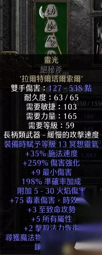 评价解析:a5任务奖励就是这套符文,所以只要之前保留了3孔盾就能做。缺抗性缺完美钻石就用这个来补抗性。 «234567891011»友情提示:支持键盘左右键"←""→"翻页 7、神圣雷击 最低使用等级:21 底材:4孔权杖 镶嵌顺序:5+8+9+7(Eth+Ral+Ort+Tal) +60%伤害 -25%目标防御 +5-30火焰伤害 +21-110电击伤害 +75毒素伤害,效果持续5秒 +10最大伤害 电击抗性+60% +5%电击抗性上限 +3级神圣雷击(圣骑士适用) 7级连锁闪电(60次)