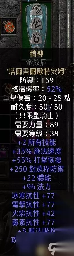 评价解析:火系法师开荒利器。注意底材普通难度可以刷a2卓格南,找一个卓格南旁边开门的地图,进出城就能刷新。如果想要好技能底材,就准备好足够的钱,30万比较保险。 «12345678910»友情提示:支持键盘左右键"←""→"翻页 6、先祖之契 最低使用等级:21 底材:3 孔盾牌 镶嵌顺序:8+9+7 (Ral+Ort+Tal) +50%防御 冰寒抗性+43% 毒素抗性+48% 火焰抗性+48% 电击抗性+48% 10%受损的生命由法力替代