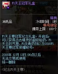 DNF2018F1天王赛冠军荣耀称号介绍 获得方法 活动期间若中国队获得F1天王赛冠军即可获得[F1天王冠军礼盒] 属性 根据往年经验来看,2018F1天王赛冠军荣耀称号是没有属性的,但是还是以官网公告为主。