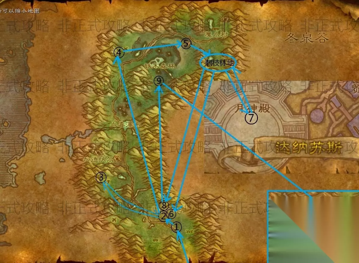 1、刚进入费伍德森林地图,联盟玩家先在路边的左手方向(摩罗萨兰54.86)发现一个女暗夜精灵,接到【55】净化费伍德任务。 2、在翡翠圣地接到【54】碧火萨特的任务。不要小瞧这些萨特,它们很有钱的……掉落恶魔布、恶魔符文不说,还有几率掉落值钱的装备和武器。 3、去克斯特拉斯废墟做【54】碧火萨特,任务需要杀的小boss萨瓦瑟拉斯在废墟的最里面。 ▶完成后回翡翠圣地交任务,接到下一步【57】更深重的堕落。 4、去地图北部的一个萨特营地碧火小径继续杀怪。萨瓦里克在碧火小径39.22,进出之后往左边山洼里找到它。杀之还掉落一个“萨瓦里克长笛”,点击接受任务【54】萨瓦里克长笛。依然是击杀萨特掉落任务物品。 5、完成两个任务之后,接着去铁木森林的铁木山洞55.17做55净化费伍德。 ▶完成后顺路去开飞行点,或者一进到费伍德地区就先去营地开飞行点。在这里可以接到任务【52】托尔瓦·寻路者(指引去安戈洛环形山)、【56】前往冬泉谷! 6、跑回翡翠圣地交任务,接到下一步【54】被禁锢的古树(去达纳苏斯)。然后去摩罗萨兰54.86找女暗夜交【55】净化费伍德任务。并对话另外一个选项,能获得塞纳里奥信标,采集系、打怪都有几率拾取到被污染的灵魂碎片,6个为一组,能换取2个塞纳里奥植物药膏,这个药膏就是治愈这片地图上被污染的植物而获得一些有益的BUFF,或者是特殊的食物。 7、去刺枝营地乘坐角鹰飞往鲁瑟兰村,然后穿过红色传送阵到达纳苏斯,用包里的任务道具收集月神殿中央的祝福之水。 8、原路返回到刺枝营地,骑马去翡翠圣地交任务,接到后续【54】“净化!”,直接NPC对话即完成任务,获得一个上古长笛。 9、去铁木森林49.29处,使用这个上古长笛,召唤一棵古树之魂——艾雷。接到任务【56】远古之灵。护送这棵古树艾雷走出铁木森林。注意!刚走出来就会遇到一场三只树怪的伏击战斗。 10、这个任务完成后需要去灰谷的林歌神殿交。此任务线结束。