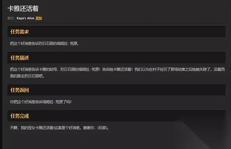 具体任务要求 玛卡巴听到卡雅还活着的任务喜出望外。 托付玩家把这个好消息带给烈日石居玛雅的姑妈。 让她知道自己的侄女还活着。