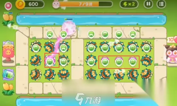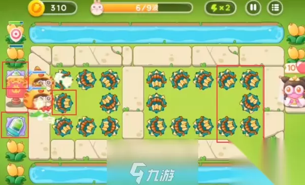 7、第七波,左边中间加一个花塔,右边中间加三个魔法球。