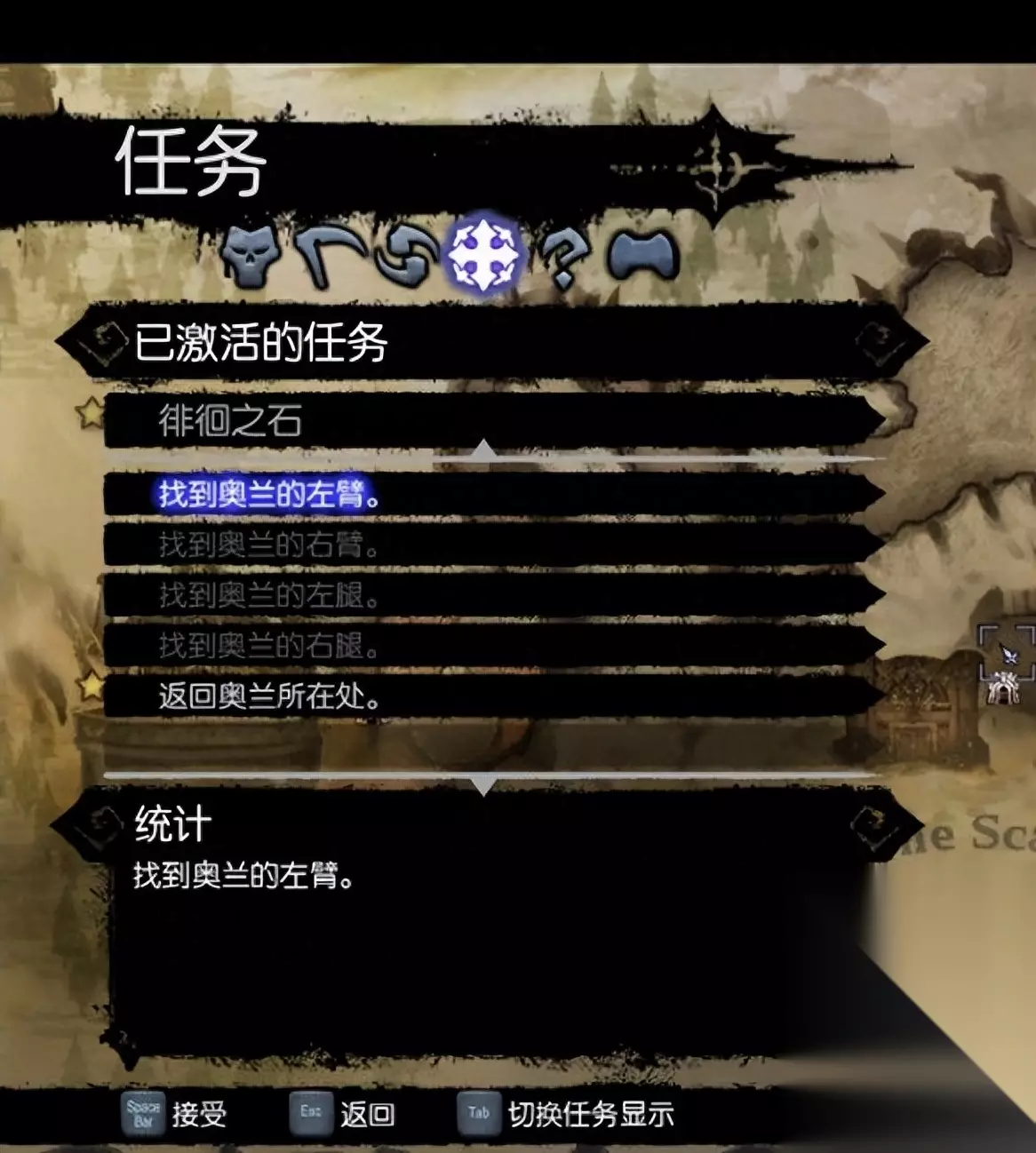 在《暗黑血统 2》中,玩家需要完成一系列任务来解锁奥兰四肢任务。该任务需要玩家寻找奥兰的四肢并击败相应的敌人。具体而言,玩家需要找到奥兰的左臂、右臂、左腿和右腿,并击败它们的守护者。 1.首先当然是要激活奥兰四肢支线这个任务: