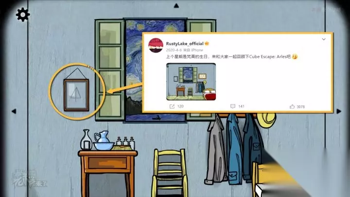 下面列出的就是隐藏关卡的解谜线索: 第一个出现的符号:RustyLake_official官方微博2020年4月6日的微博信息,窗边墙面镜框中展现【△】