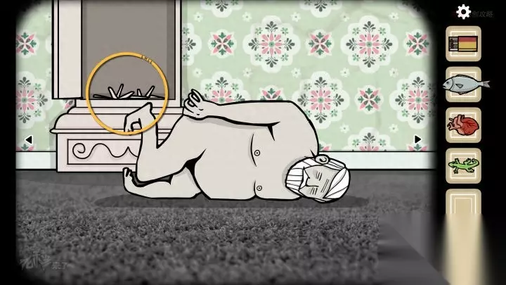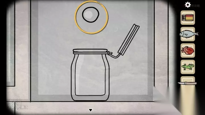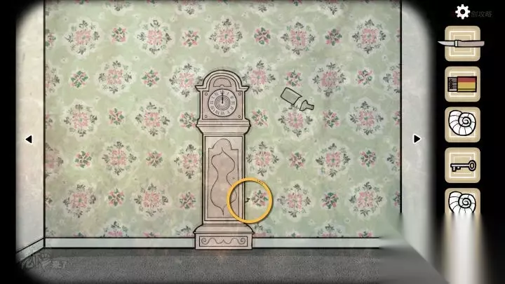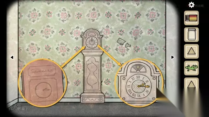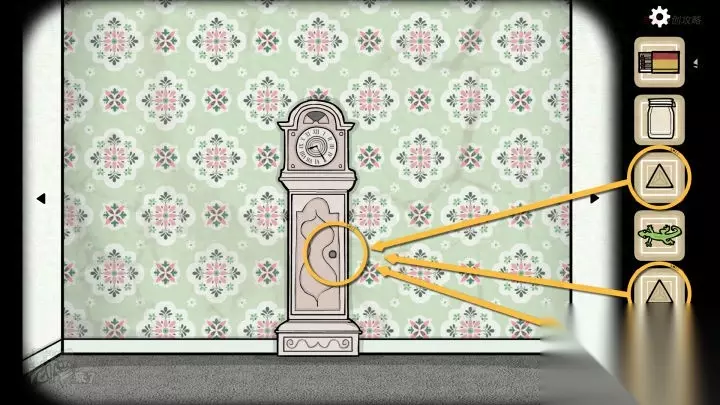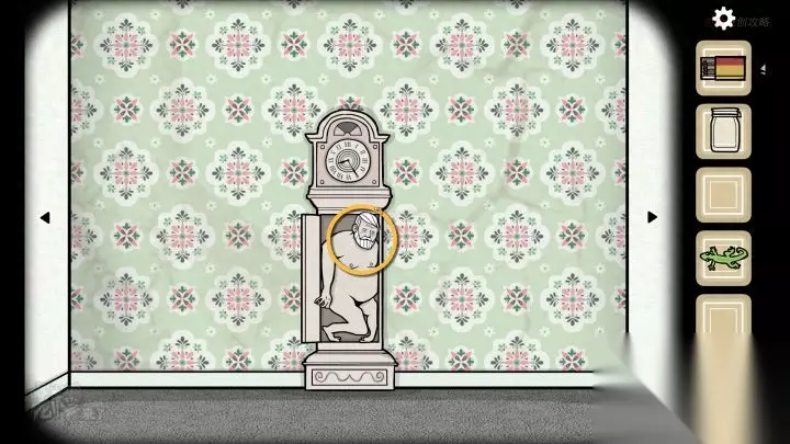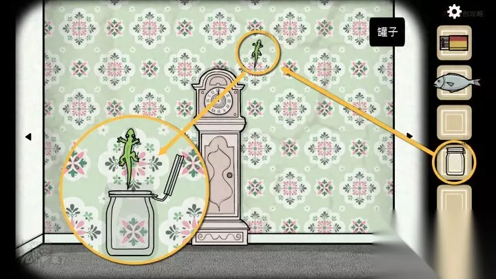 人形-落地钟视角:点击墙面上的【壁虎】(如果不在这里,应该是之前点击过它,换个视角会找到)用【罐子】抓住【壁虎】