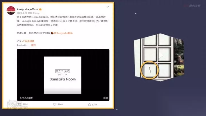 4. 第四个出现的符号:RustyLake_official官方微博2020年4月29日的微博信息,在视频的第8秒的窗框处看到【S】