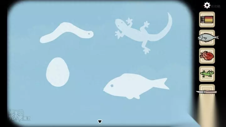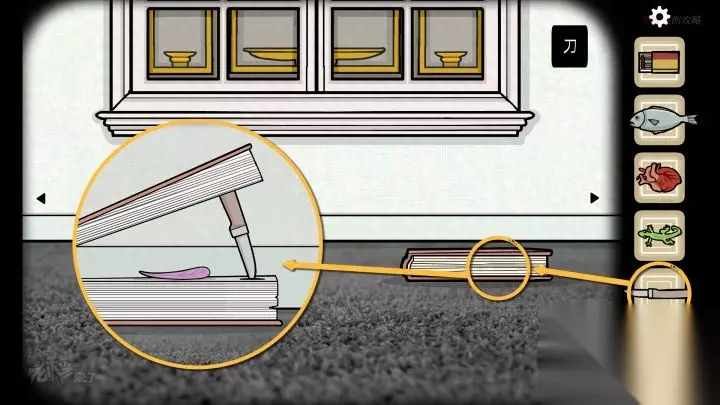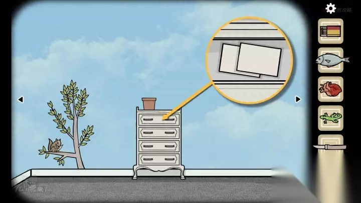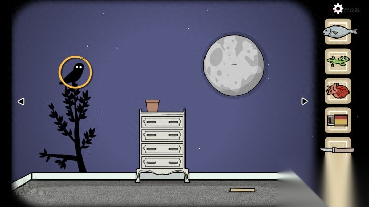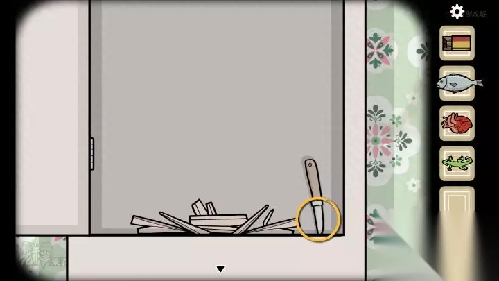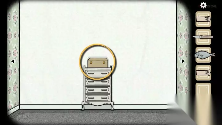 人形-斗柜视角:分别打开第2、3、4个【抽屉】,分别拾取【刀】、【鱼】和【蜡烛】