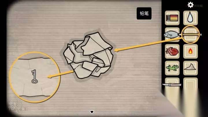 虾-镜子视角:用【铅笔】在纸上画【钥匙】,再捏成团,然后再打开可以拾取【钥匙】