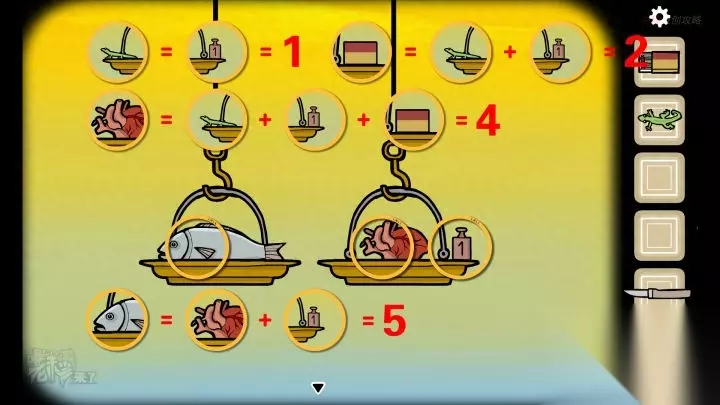鸟形-镜子视角-晚上:将【心脏】放在左侧,【砝码】、【壁虎】和【火柴】放在右侧,得到【心脏的重量】=4