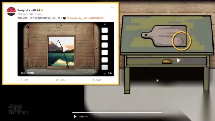 3. 第三个出现的符号:RustyLake_official官方微博2020年4月27日的微博信息,在视频的第32秒的菜板上会出现,即【螺旋圈】