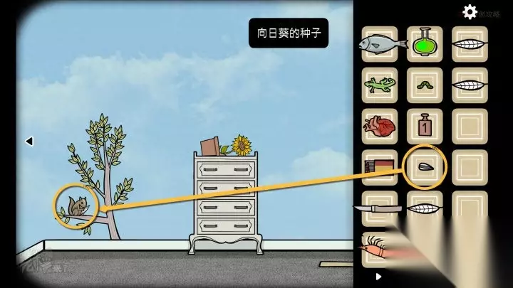鸟形-斗柜视角-晚上:将【太阳】拉伸到【向日葵】倒下,拾取【瓜子】